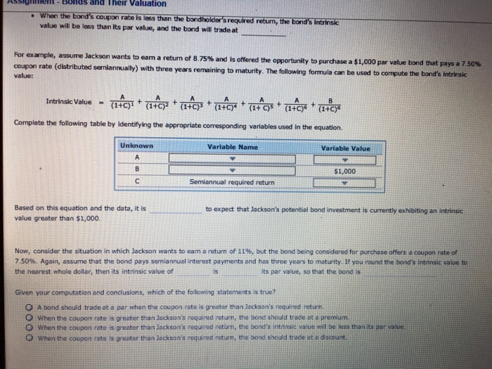 Coupon value of a bond. Coupon Rate Definition - Investopedia A bond's coupon rate can be calculated by dividing the sum of the security's annual coupon payments and dividing them by the bond's par value. For example, a bond issued with a face value of $1,000... › bond-basics-417057Bond Basics: Issue Size and Date, Maturity Value, Coupon May 28, 2022 · Coupon and Yield to Maturity . The coupon rate is the periodic interest payment that the issuer makes during the life of the bond. For instance, a bond with a $10,000 maturity value might offer a coupon of 5%. Then, you can expect to receive $500 each year until the bond matures. Calculate the Value of a Coupon Paying Bond - Finance Train The value of a coupon paying bond is calculated by discounting the future payments (coupon and principal) by an appropriate discount rate. Suppose you have a bond with a $1,000 face value that matures 1 year from today. The coupon rate is 12% and the bond makes semi-annual coupon payments of $60. The bond yield is 13%. › Zero_Coupon_Bond_ValueZero Coupon Bond Value - Formula (with Calculator) After 5 years, the bond could then be redeemed for the $100 face value. Example of Zero Coupon Bond Formula with Rate Changes. A 6 year bond was originally issued one year ago with a face value of $100 and a rate of 6%. As the prior example shows, the value at the 6% rate with 5 years remaining would be $74.73.