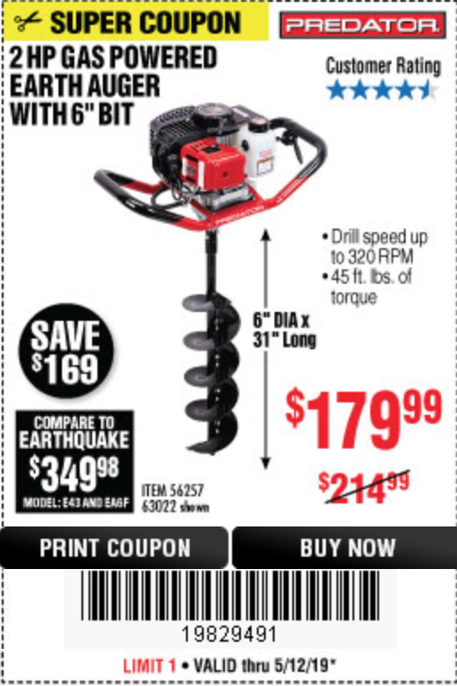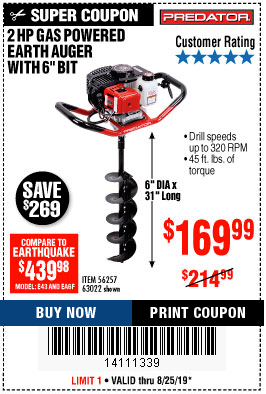 PREDATOR Gas Powered Earth Auger for $179.99 - Harbor Freight Coupons Buy the PREDATOR Gas Powered Earth Auger (Item 56257) for $179.99 with coupon code 30271430, valid through June 30, 2020. See the coupon for details. Compare our price of $179.99 to Earthquake at $439.98 (model number: E43, EA6F). Save $259 by shopping at Harbor Freight. Meet the PREDATOR Gas Powered Earth Auger.