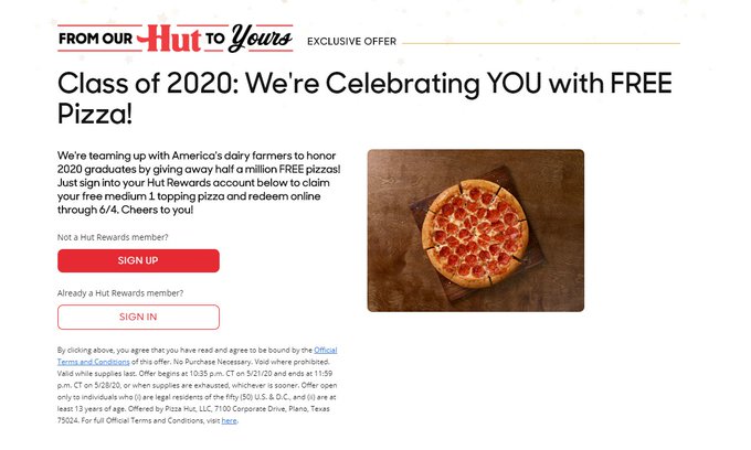 Pizza Hut Coupons, Promo Codes & Deals - September 2022 - Savings.com Recently Expired Pizza Hut Coupons DV 20% Off Select Orders Buy 1 Large Pizza with Visa Checkout, Get 1 Free on a Future Order ONLG9 Get Large Pizza With Any Toppings for $9 $10 dinner box Any pizza just $11 Today's Top Pizza Hut Coupons Save on Current Deals and Multibuys 2 Pizzas for $6.99 Best Pizza Hut Deals Available Now