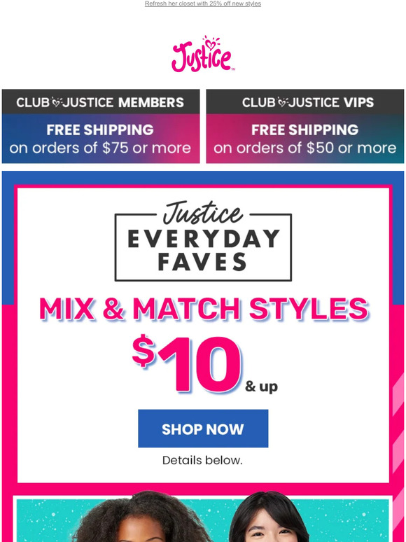 15% Off Justice Coupons, Coupon Codes - RetailMeNot Justice Coupons & Promo Codes Submit a Coupon In-Store Pickup Curbside Delivery 15% OFF Code Additional 15% Off Sitewide Verified Added by Mik19 Show Coupon Code See Details FREE SHIPPING Sale Free Shipping on $75 For Members & on $50+ For VIP Members 2 uses today See Details 15% OFF Code 15% Off Your Purchase Verified Added by schomprmn060544